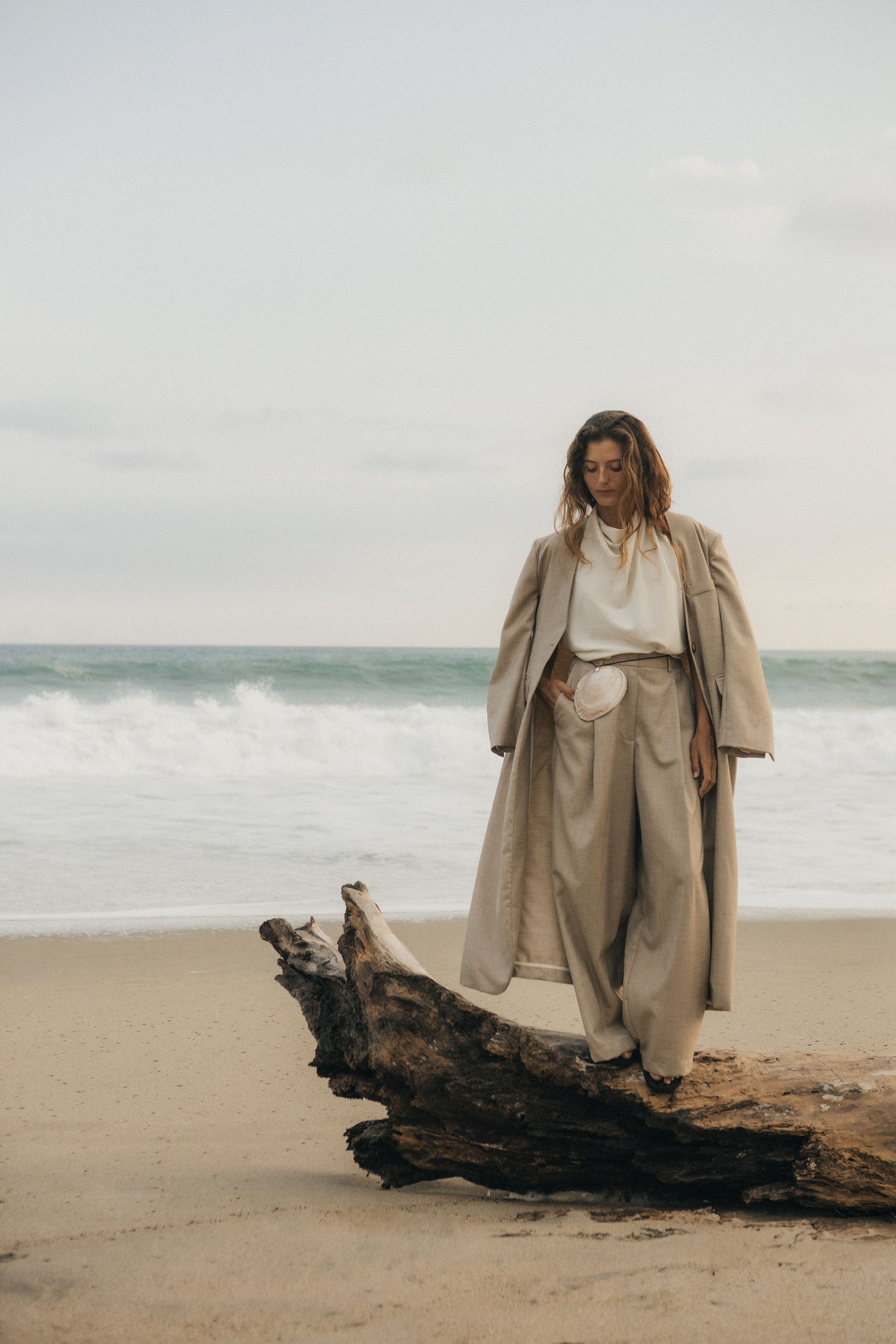 The Long Collarless Coat extends the clean lines of the blazer into outerwear. Cut in a lightweight wool-silk-linen blend and fully lined, it's finished with pockets and a single button closure for an uninterrupted silhouette. Pair it with the Herringbone Wide Leg Pleated Trouser for a balanced pairing, or wear it over any trousers for day-to-day composure.