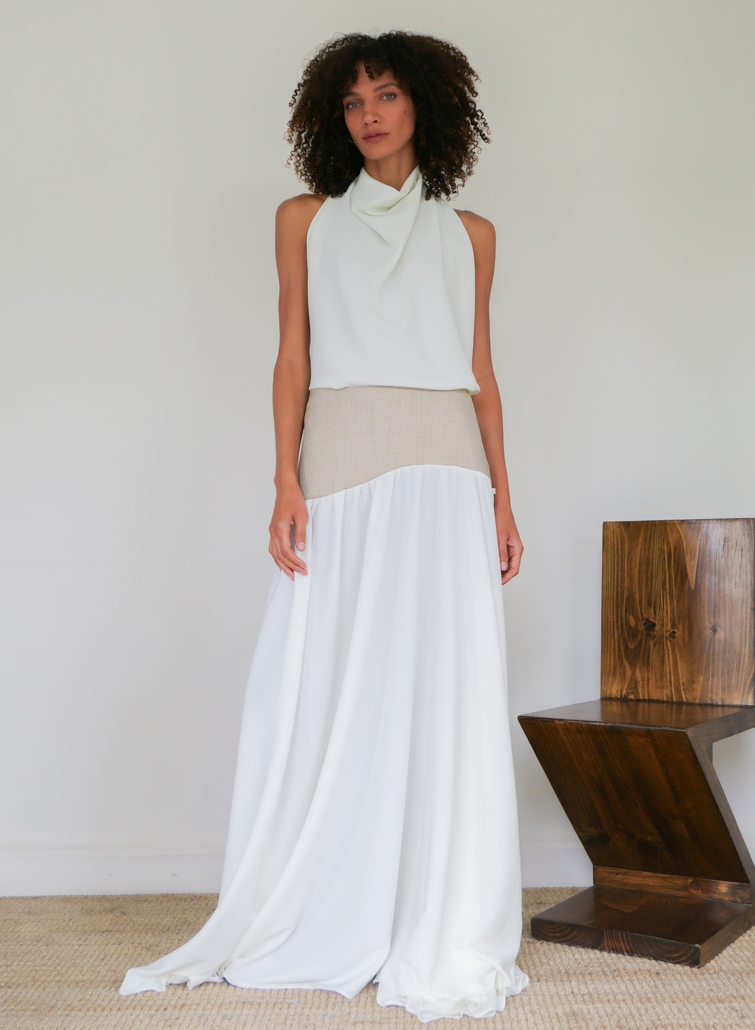 An effortless drape defines this halter-style top, cut to fall into soft folds through the front and twist into a low, open back secured with a button closure. Its fluid cut brings movement and dimension, while the simplicity of the shape makes it adaptable to both tailored and relaxed separates. Wear it with trousers to elevate a cocktail-hour look, or pair it with the Long Wave Skirt for a considered statement.