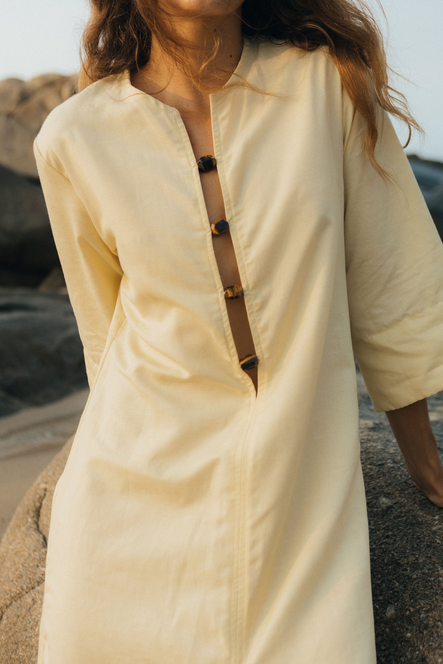 Designed with a clean front split, the tunic is finished with hand-sewn tiger’s eye closures placed close to the heart, an intentional detail traditionally associated with grounding and confidence. The silhouette is relaxed and elongated, balancing masculine tailoring with feminine ease.