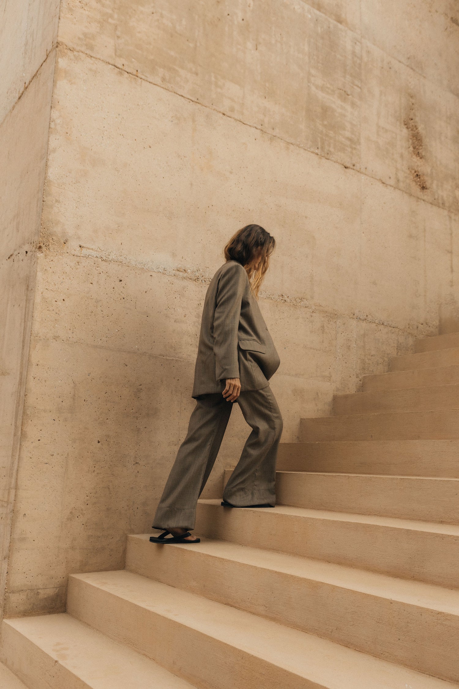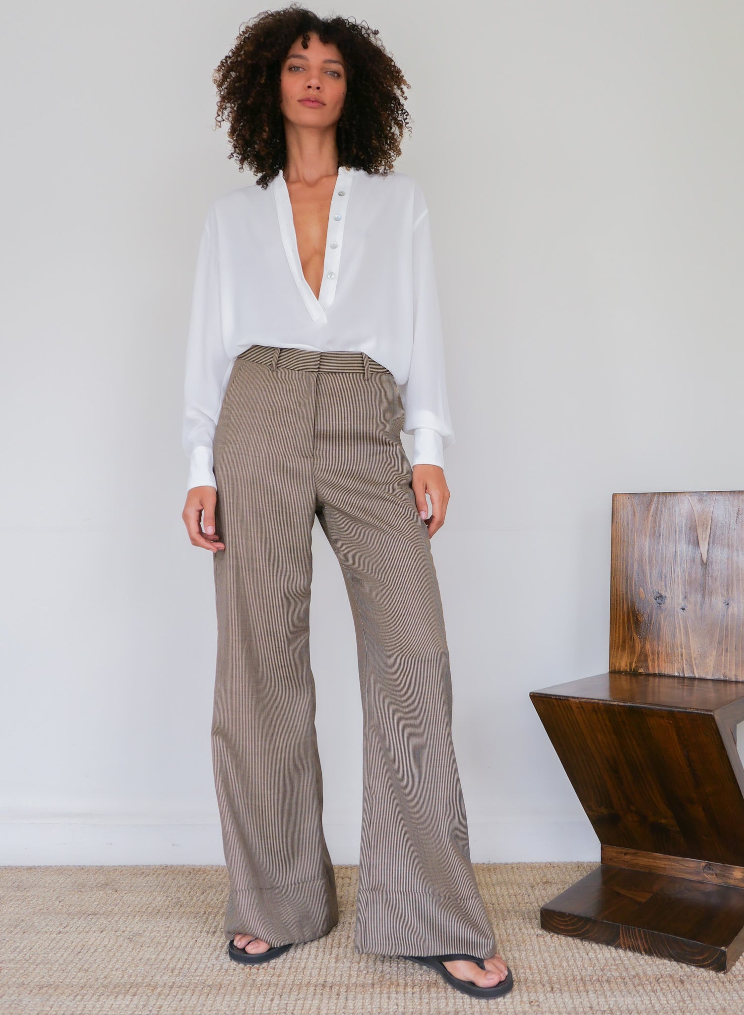 Tailored in a lightweight wool with a flat front, the Stripe Flare Trouser is cut to a wide, slightly flared leg that elongates the frame. Rendered in a fine stripe to emphasise the line of the leg, it offers a classic silhouette, elevated with understated distinction. Designed with a zip-front closure and side pockets, it maintains clean lines while remaining wearable. An uncomplicated piece that carries its own polish.